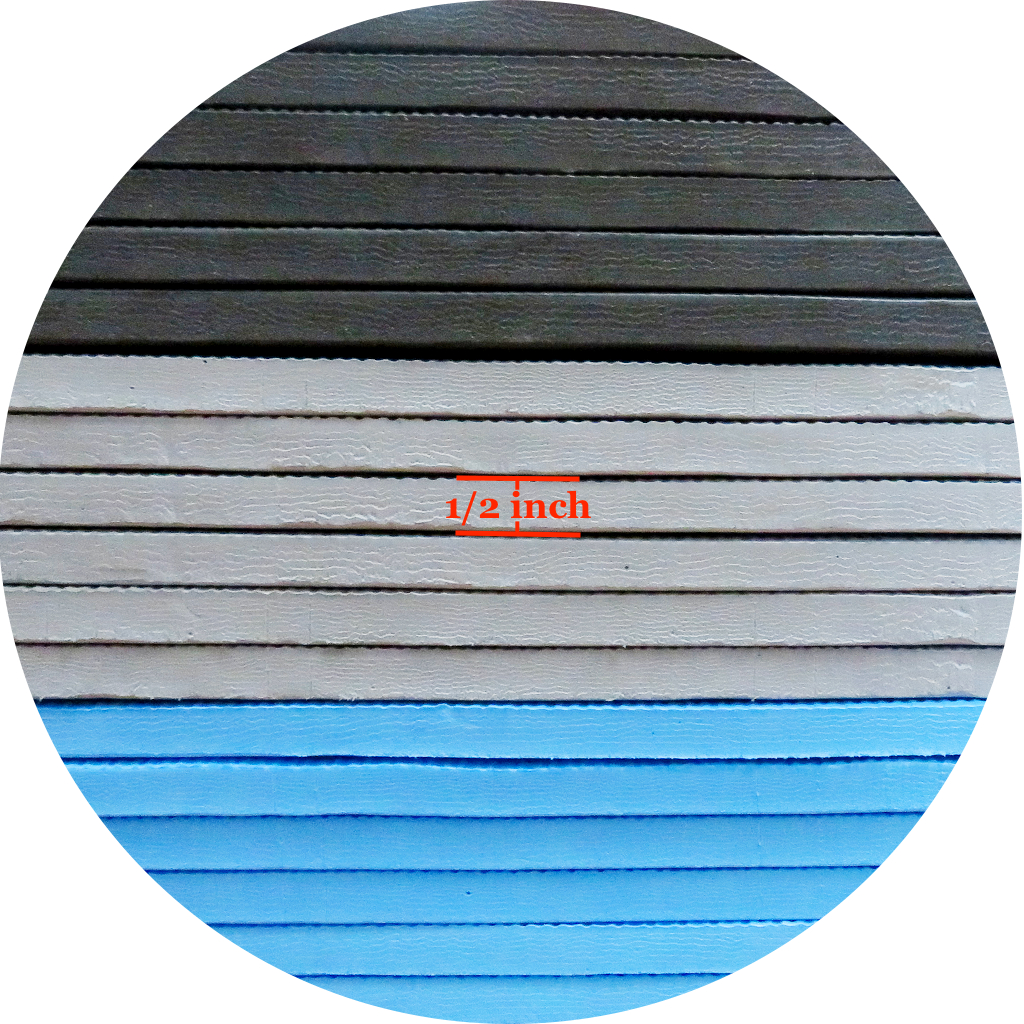 1/2" Thick, 24 Square Feet: Item comes with 6 tiles and 12 end borders at 1/2" thick. Each tile measures 24"x24"x1/2". Covers 24 Square Feet area.