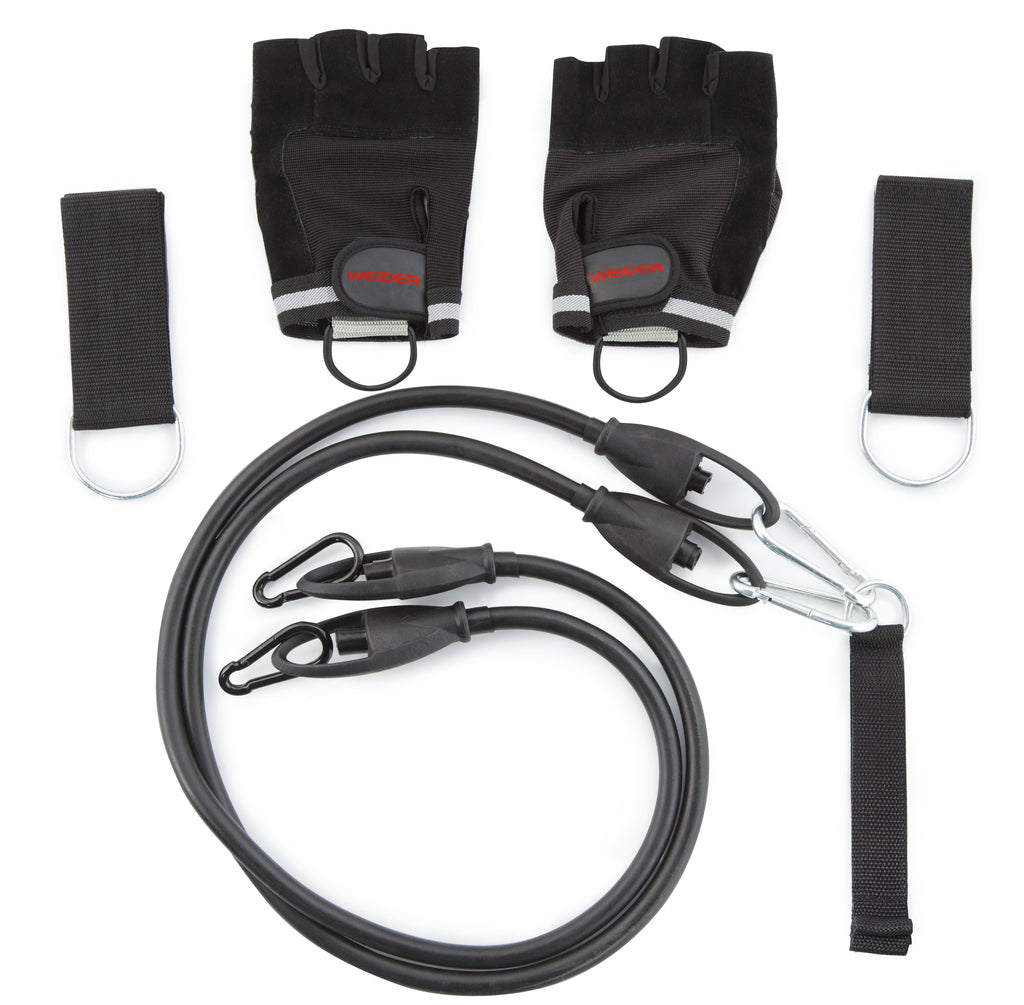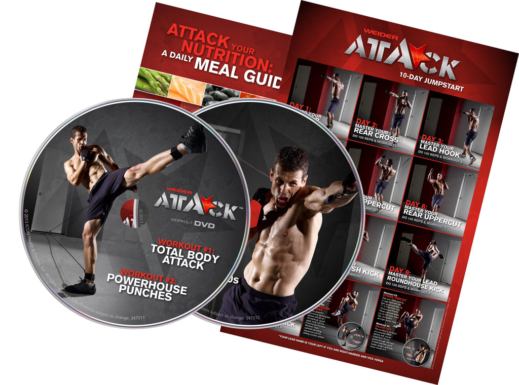 Tackle your strength and fitness goals with the Attack MMA-Style DVD Training Kit from strength titan Weider. This at-home training kit comes with two professional workout DVDs so you can follow along with and learn from certified personal trainers without leaving the privacy of your home. Engage with these high-energy workouts while wearing your included leather training gloves to protect your hands and enjoy the full MMA experience. Crafted from genuine leather, these gloves can get you through your most intense workout sessions. Ankle attachments are also included so you can build strength in your lower body. Powerful resistance tubes can easily hook onto your leather training gloves and ankle straps, giving you the ability to target and tone every major muscle group in your body. Sculpt your arms, chest, back, shoulders, legs, and core with this dynamic exercise tool - all without having to purchase an expensive gym membership or leave the privacy of your home. A professionally-designed nutrition guide will help you take control of your diet, supplementing your exercise to maximize the benefit of your training. Keep track of your workout schedule and monitor every session with an included workout calendar to make sure you stay on track to meet your goals.